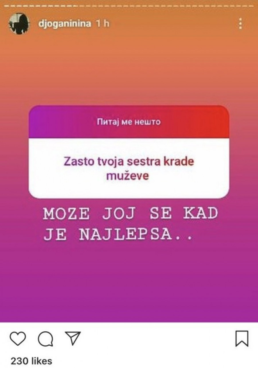 Foto: printscreen/instagramIli, u ovom slučaju, sestro slatka! I jeste mala Nina (13) sestre Lune Đogani, ali opravdati otimanje tuđih muževa pukom lepotom ljubavnice - to nešto ozbiljno škripi u sistemu vrednosti i obično se dešava kad ti mama i tata ne objasne neke stvari... E sad, da li je to slučaj i sa Ninom, da ne nagađamo, ali da je njena objava na društvenim mrežama besramna kao i ponašanje njene sestre u rijalitiju "Zadruga" - to je sigurno.