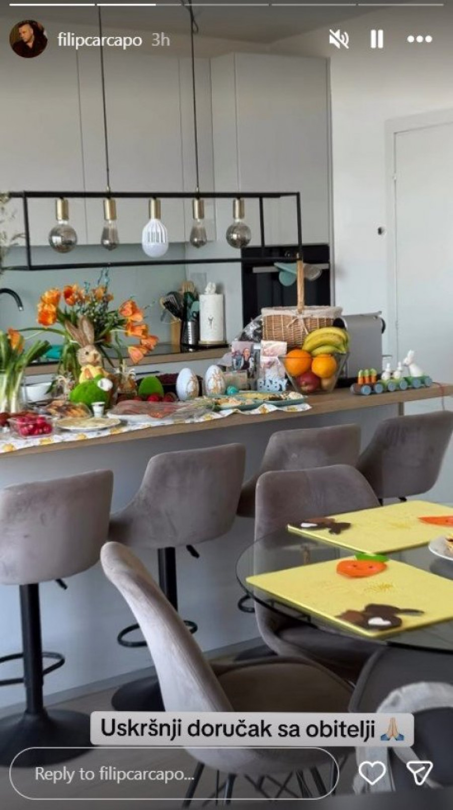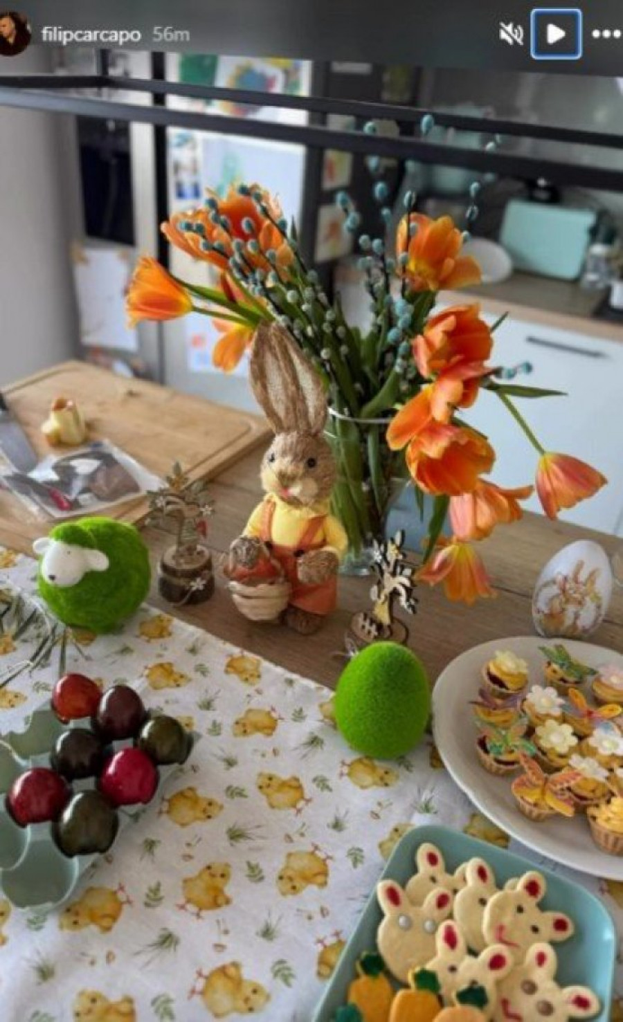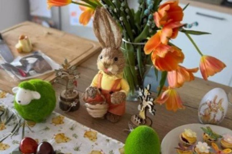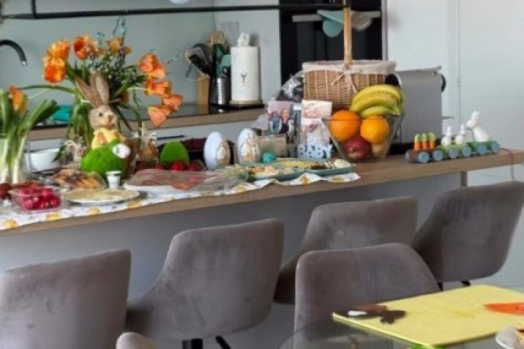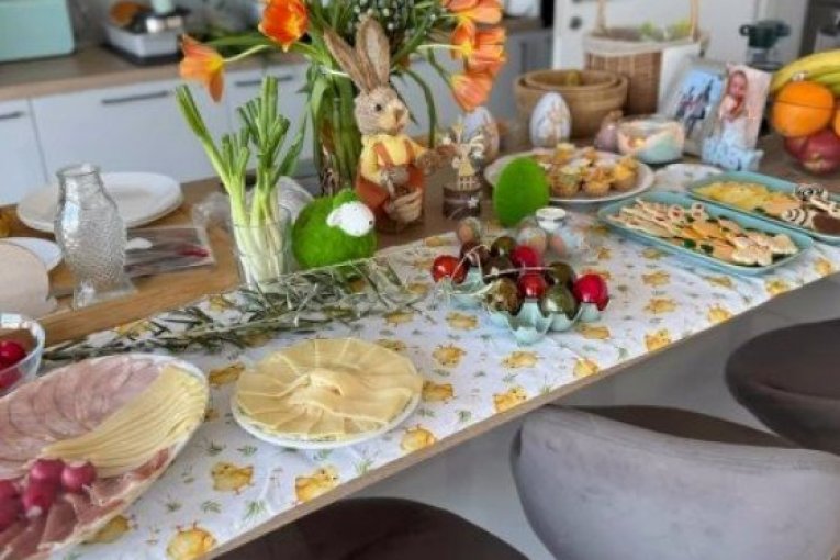 Stolnjak sa motivima pilića, bogat buket narandžastih lala, uskršnje figurice i raznobojni kolačići ukrašeni cvetićima i leptirićima, sve to stvara savršenu atmosferu. Filip se potrudio da sve bude savršeno – od tradicionalno ofarbanih jaja u intenzivnim bojama do domaćih kolača posutih šećerom u prahu, koji mame uzdahe. Čitava trpezarija, koja se može videti na fotografijama, deluje kao praznični raj, sa modernom kuhinjom i pažljivo složenim detaljima koji dodatno doprinose utisku porodične topline.