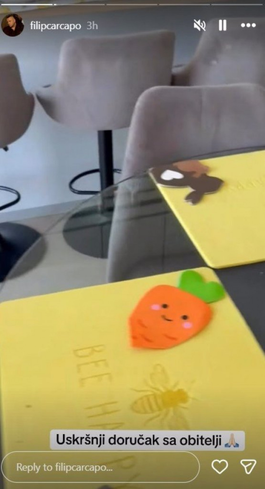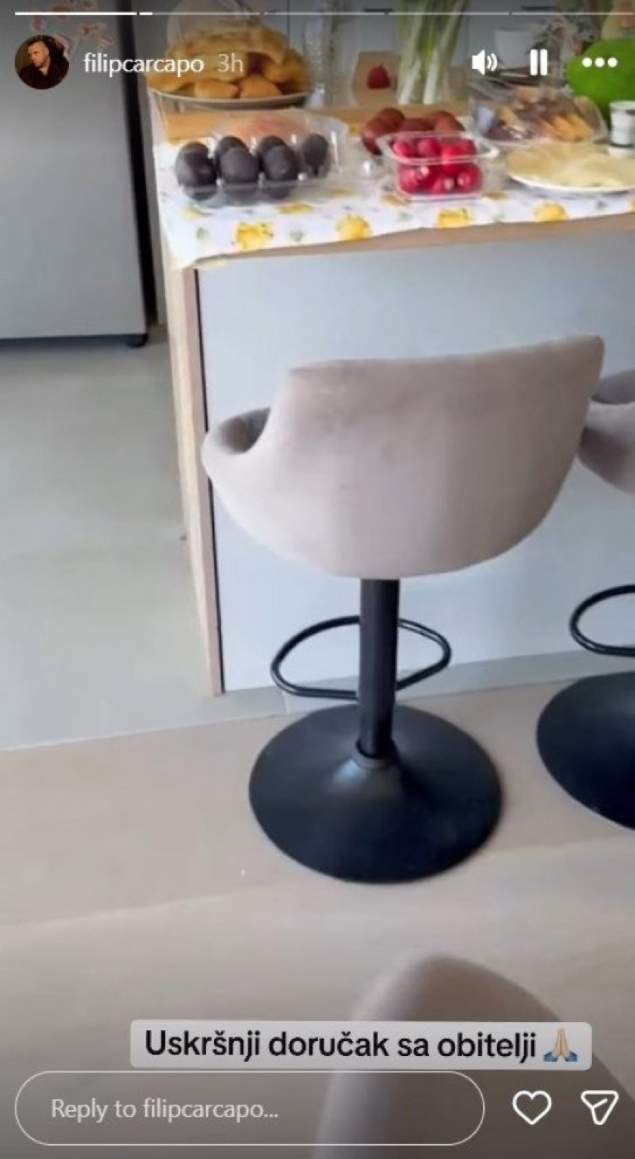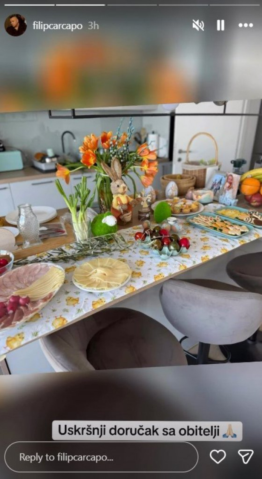 Stolnjak sa motivima pilića, bogat buket narandžastih lala, uskršnje figurice i raznobojni kolačići ukrašeni cvetićima i leptirićima, sve to stvara savršenu atmosferu. Filip se potrudio da sve bude savršeno – od tradicionalno ofarbanih jaja u intenzivnim bojama do domaćih kolača posutih šećerom u prahu, koji mame uzdahe. Čitava trpezarija, koja se može videti na fotografijama, deluje kao praznični raj, sa modernom kuhinjom i pažljivo složenim detaljima koji dodatno doprinose utisku porodične topline.