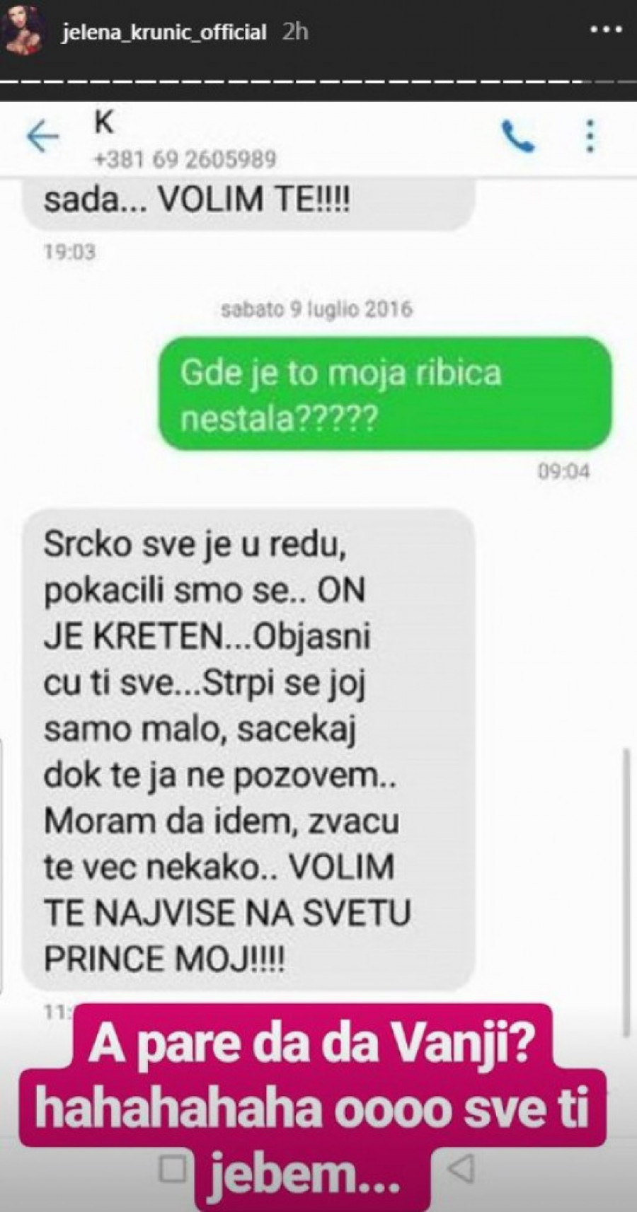 Foto: instagram.com/jelena_krunic_officialA da je u to vreme bila sa Slobom u vezi, osim datuma kada je nastala prepiska, svedoči i poruka koju je poslala nešto kasnije:
