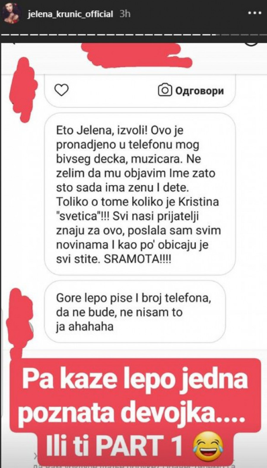 Foto: instagram.com/jelena_krunic_officialA kao dokaz da poruke pripadaju Kiji, Krunićeva navodi broj telefona koji je Kockarova nekada koristila.