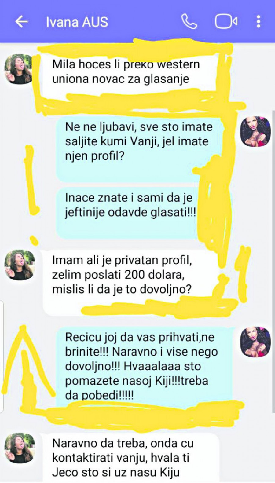 Kako bi dokazala svoje navode, Jelena Krunić je redakciji Srpskog telegrafa dostavila printskrinove svojih dopisivanja sa Kijinim fanovima koji su je pitali gde da uplate novac, dok ih je ona usmeravala na Vanju Ibrahimović. Takođe, postoje prepiske na kojima fanovi pitaju da li je dosta da pošalju 200 dolara, pitaju Ibrahimovićku koji sat bi se najviše svideo Kristini kad izađe, kako bi znali koliko novca da pošalju Vanji da joj to kupi, kao i uplatnice da je novac prebačen na račun Kockarkine kume.
