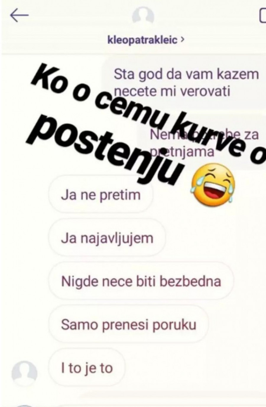 Foto: printscreen/instagram.com/andrijana_official- Šta je sad psihopate?! Eto vam ga Đekson, sad odjednom imate sa mnom problem? Žao mi je što morate meni da pretite da biste ispali veliki, ali džaba, šta god da uradite meni, neće od vas uspeti da napravi dame i ozbiljne žene, jer, ja se ne predajem za razliku od nekih. Pozdrav - napisala je Radonjićeva na ove pretnje.