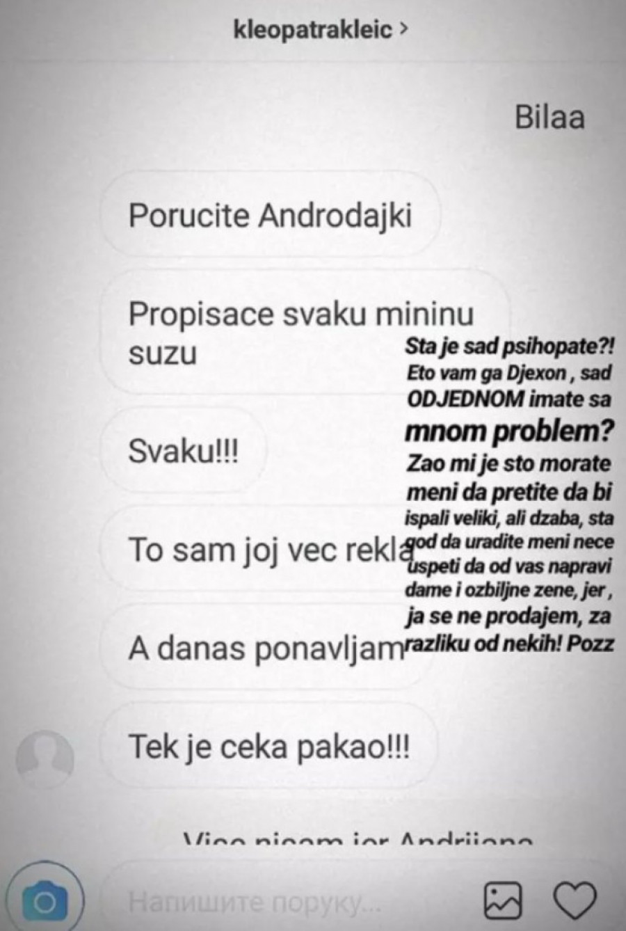 Foto: printscreen/instagram.com/andrijana_official- Poručite Androdajki, propi*aće svaku Mininu suzu! Svaku! To sam joj već rekla a danas ponavljam. Tek je čeka pakao. Ja ne pretim ja najavljujem. Nigde neće biti bezbedna - piše u porukama koje je Andrijana dobila.