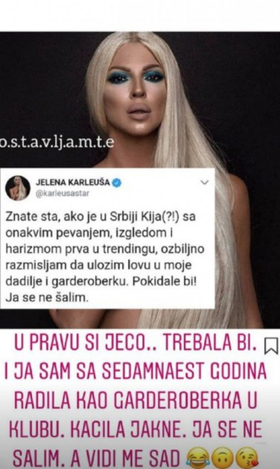- U pravu si Jeco, trebala bi. I ja sam sa sedamnaest godina radila kao garderoberka u klubu. Kačila jakne. Ja se ne šalim, A vidi me sad - napisala je Kija na Instagramu. Jelena se tu nije zaustavila, već nastavlja sa provokacijama u svom stilu.