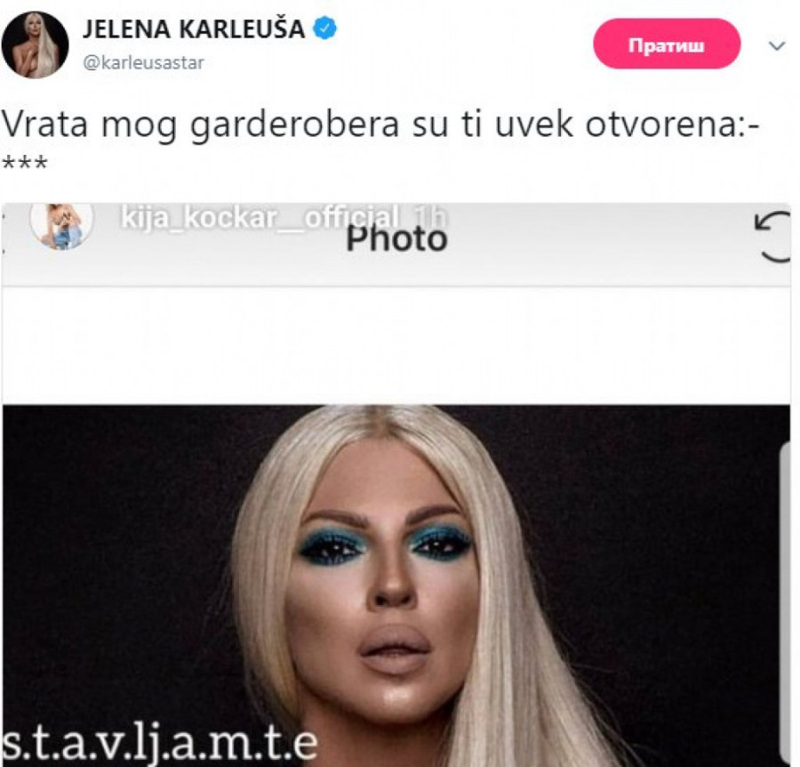 Foto: instagram.com/karleusastar- Znate šta, ako je u Srbiji Kija (?!) sa onakvim pevanjem, izgledom i harizmom prva u trendingu, ozbiljno razmišljam da uložim lovu u moje dadilje i garderoberku. Pokidale bi! Ja se ne šalim - napisala je Jelena na Tviteru.