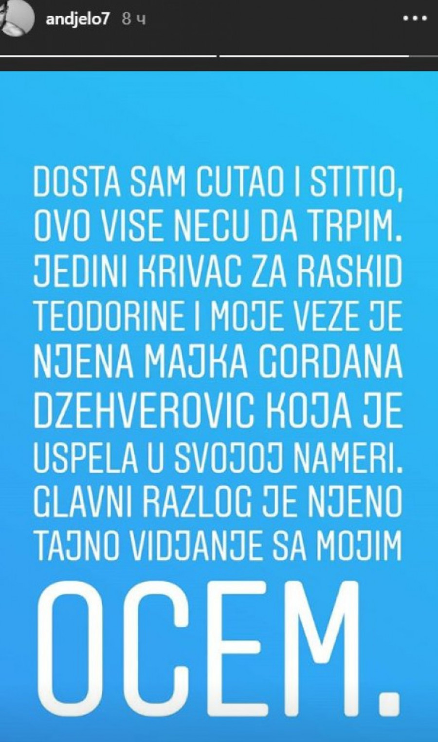 Naime, kako više nije mogao da ćuti, Anđelo je priznao da je glavni krivac kraha njegove veze sa Teodorom upravo njena majka Gordana Džehverović i to najviše zbog toga što se tajno sastaje sa njegovim ocem.