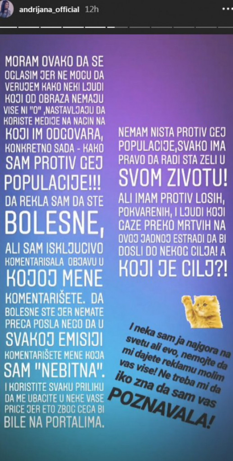 - Moram ovako da se oglasim jer ne mogu da verujem kako neki ljudi koji od obraza nemaju više od "o", nastavljaju da koriste medije na način na koji im odgovara konkretno sada - kako sam protiv gej populacije!!! Da, rekla sam da ste bolesne, ali sam isključivo komentarisala objavu u kojoj mene komentarišete. Bolesne ste, jer nemate preča posla, nego da u svakoj emisiji komentarišete samo mene koja sam "nebitna" i koristite svaku priliku da me ubacite u neke vaše priče, jer eto zbog čega bi bile na portalima. Nemam ništa protiv gej populacije, svako ima pravo da readi šta god želi u svom životu, ali imam protiv loših, pokvarenih i ljudi koji gaze preko mrtvih na ovoj jadnoj estradi da bi došli do nekog cilja! Koji je cilj?! I neka sam ja najgora na svetu, ali evo, nemojte da mi dajete reklamu molim vas više. Ne treba mi da iko zna da sam vas poznavala - uzvratila je Andrijana na prozivke bivših zadrugarki.