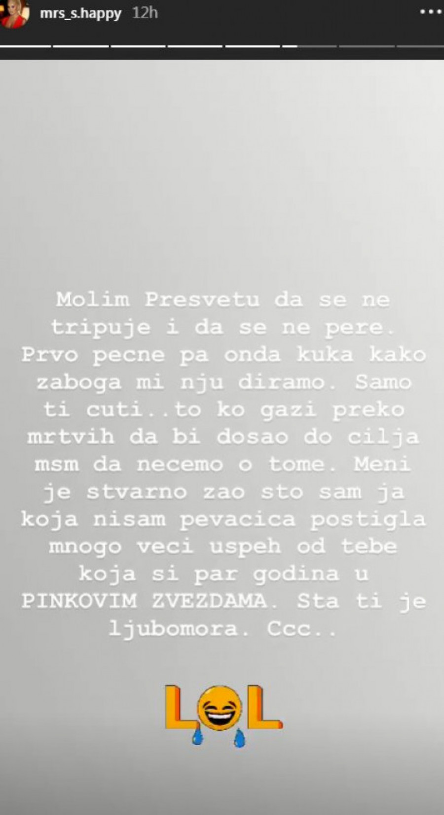 - Molim presvetu da se ne tripuje i da se ne pere. Prvo pecne, pa onda kljuka kako, zaboga, mi nju diramo. Samo ti ćuti... To ko gazi do mrtvih da bi došao do cilja... nećemo o tome. Meni je stvarno žao, što sam ja, koja nisam pevačica, postigla mnogo veći uspeh od tebe, koja si nekoliko godina u Pinkovim zvezdama. Šta ti je ljubomara... Ccc - napisala je Sanja u okviru svog Instagram storija.