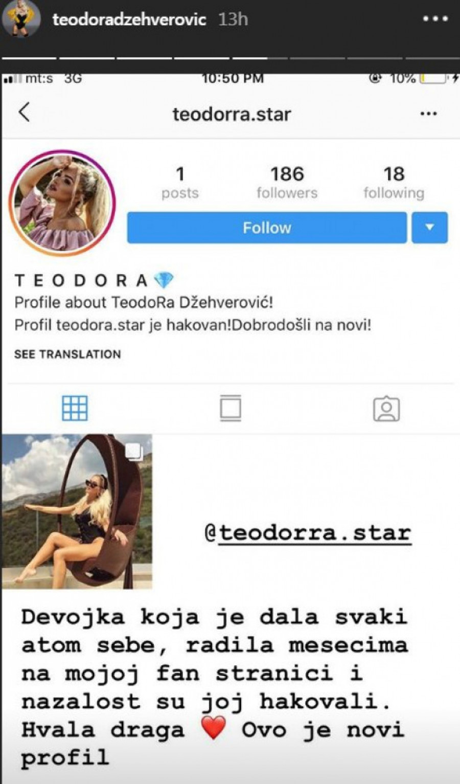 - Devojka koja je dala svaki atom sebe, radila mesecima na mojoj fan stranici, nažalost su joj hakovali. Hvala draga - napisala je Teodora.