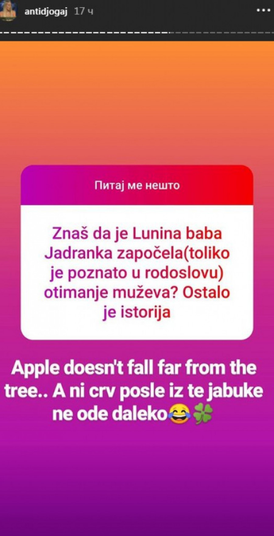 E, sada se na popularnoj Instagram stranici koja hejtuje Lunu Đogani pojavila informacija da je njena baba Jadranka svojevremeno otela tuđeg muškarca i kako se gen za "krađu nečijih jačih polovina" kod njih prenosi po ženskoj liniji sa kolena na koleno.