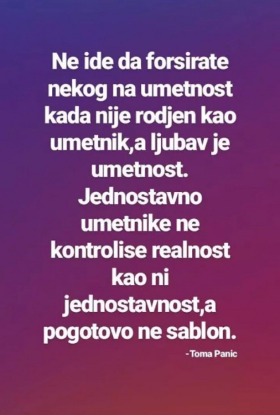 - Ne ide da forsirate nekog na umetnost kada nije rođen kao umetnik, a ljubav je umetnost. Jednostavno umetnike ne kontroliše realnost kao ni jednostavnost, a pogotovo ne šablon - napisao je Toma.