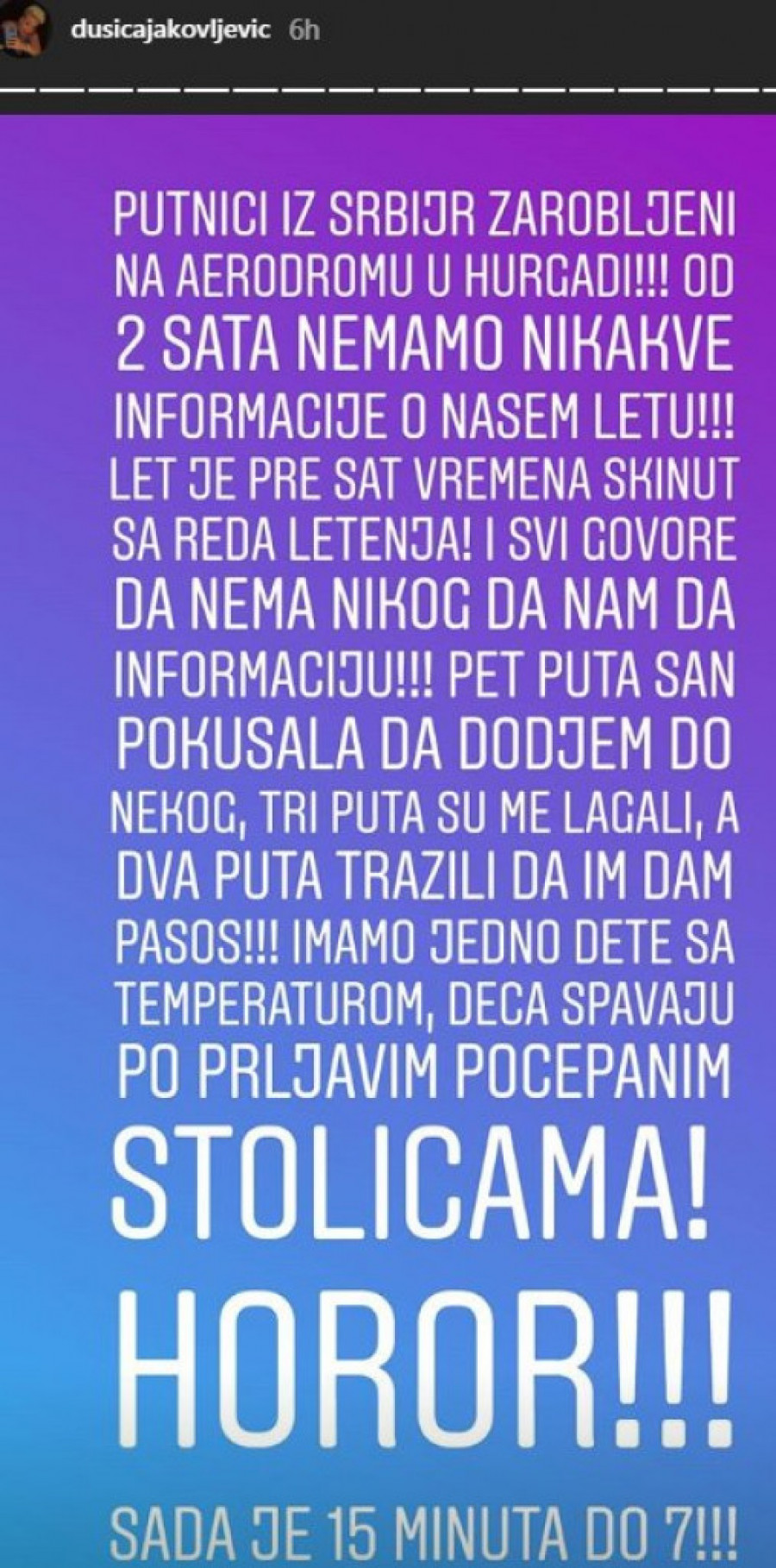 - Putnici iz Srbije zarobljeni na aerodromu u Hurgadi! Od dva sata nemamo nikakve informacije o našem letu! Let je pre sat vremena skinut sa reda letenja! Pet puta sam pokušala da dođem do nekoga, tri puta su me lagali, a dva puta tražili da im dam psaoš! Imamo jedno dete sa temperaturom, deca spavaju po prljavim pocepanim stolicama! Horor - glasila je Instagram priča voditeljke.