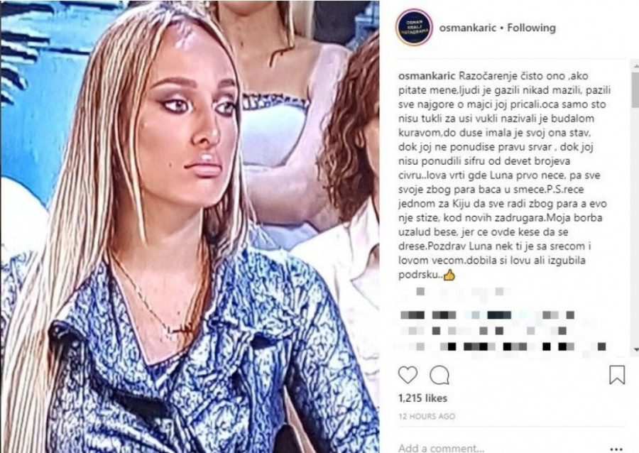 P.S reče jednom za Kiju da sve radi zbog para a evo nje stiže, kod novih zadrugara. Moja borba uzalud beše, jer će ovde kese da se dreše. Pozdrav Luna nek ti je sa srećom i lovom većom. Dobila si lovu ali izgubila podršku - napisao je Osman.