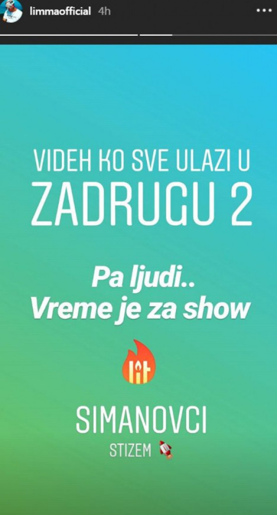 - Videh ko sve ulazi u Zadrugu 2. Pa ljudi... vreme je za šou. Šimanovci, stižem - piše u Limminoj objavi.
