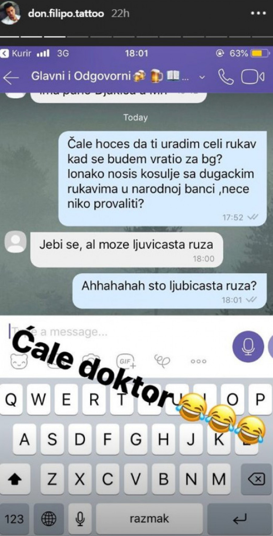 - Ćale, hoćeš da ti uradim ceo rukav kad se budem vratio za Beograd? Ionako nosiš košulje sa dugačkim rukavima u narodnoj banci, neće niko provaliti - napisao je Filip.