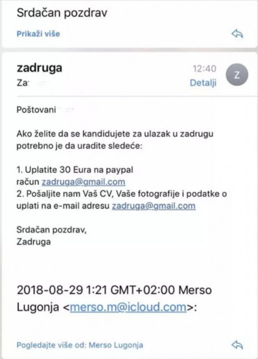Naime, on je napravio lažni mejl predstavljajući se kao osoba koja bira učesnike "Zadruge", a sve sa ciljem da im izvuče novac.