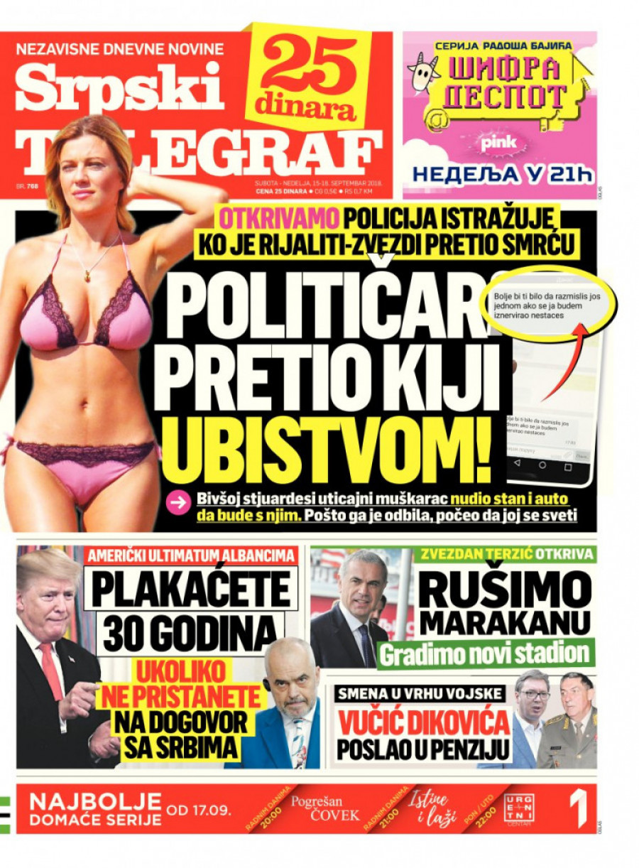 Sve o ovoj temi možete da pročitate u vikend izdanju Srpskog telegrafa, za subotu i nedelju 15. i 16. septembar. U našim novinama takođe možete da pročitate kakvu brutalnu poruku su Amerikanci poslali Šiptarima, a u vezi sa dijalogom Beograda i Prištine, kao i to kakvi su planovi za naš najveći stadion i zašto se govori i o rušenju nekadašnje "Marakane"?
