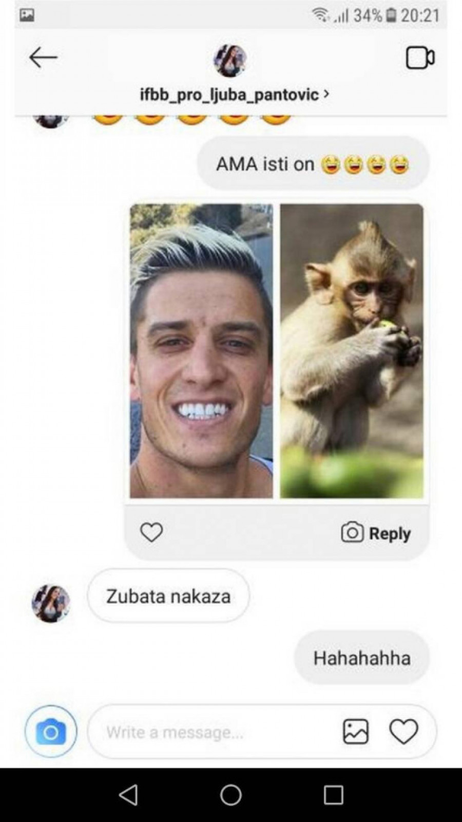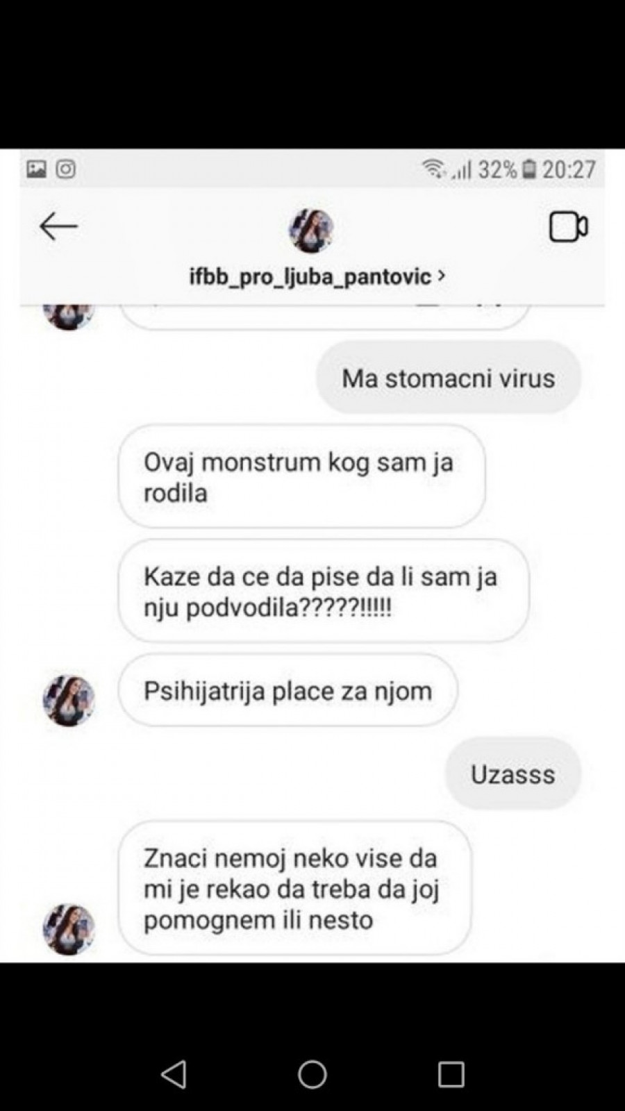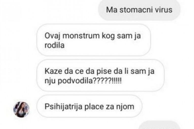 Foto: instagram.com/ljuba_championNaime, u privatnoj prepisci sa prijateljem Ljuba nije birala reči, te je oplela kako po ćerki, tako i po Davidu. Prijatelju je napisala: "Meni su Aleksandra i David krajnje žalosni. Čujem da je golu bebu izbacivala na društvene mreže dok je onaj ološ i raspali klošar kupa. Ljudi mi pišu zgroženi. Ovaj monstrum kog sam ja rodila kaže da će da piše da li sam ja nju podvodila?! Psihijatrija plače za njom. Nemoj više niko da mi je rekao da treba da joj pomognem ili nešto" - stoji u prepisci sa Instagrama, a u nastavku dopisivanja Davida upoređuje sa majmunom, te govori da je zubat.