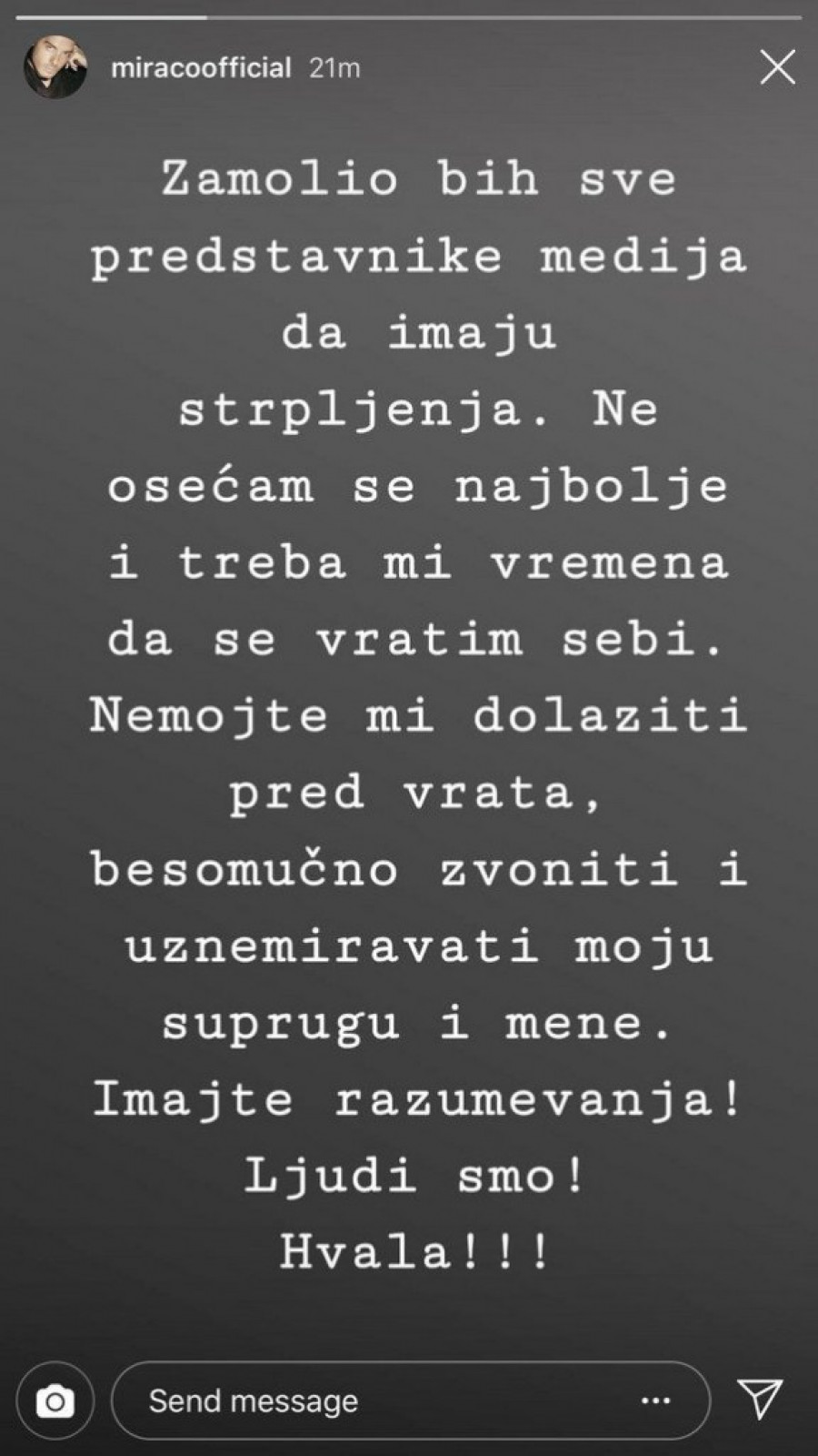 Foto: printscreen/instagram.com/miracoofficialOn se danas, međutim, oglasio novom porukom i tom prilikom priznao da se ne oseća baš najbolje: