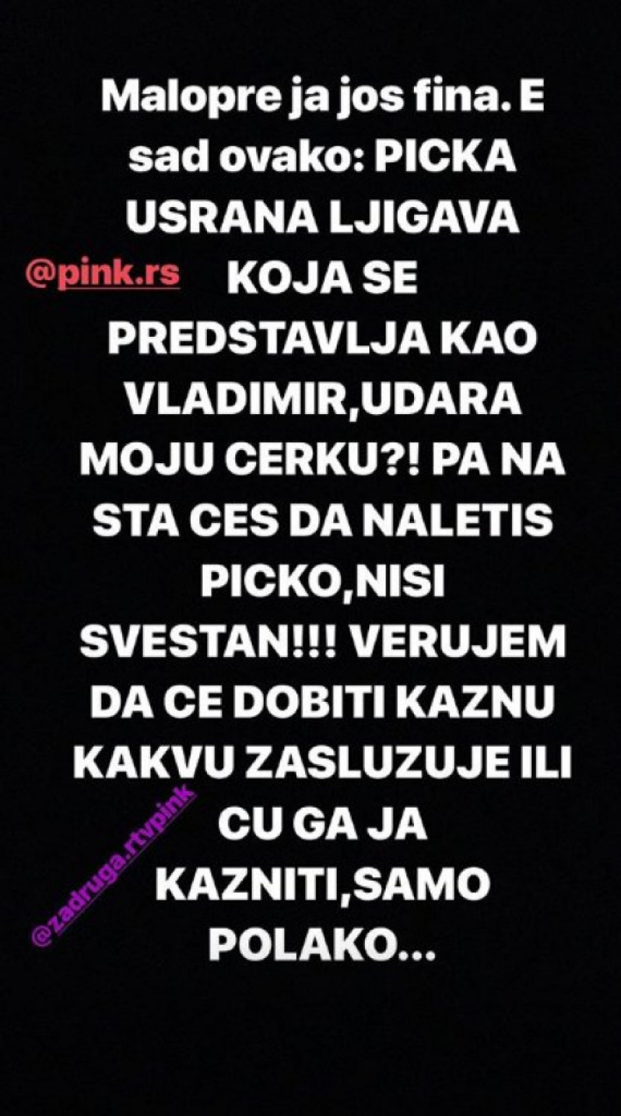 - Malopre ja još fina. E sad ovako: Pi*ka usrana ljigava koja se predstavlja kao Vladimir, udara moju ćerku?! Pa na šta ćeš da naletiš pi*ko, nisi svestan. Verujem da će dobiti kaznu kakvu zaslužuje ili ću ga ja kazniti, samo polako. Pi*ko usrana, pa dobro mi došao u spoljni svet! Vladimirka, u najavi ćeš postaješ devojčica zbog ovoga!"