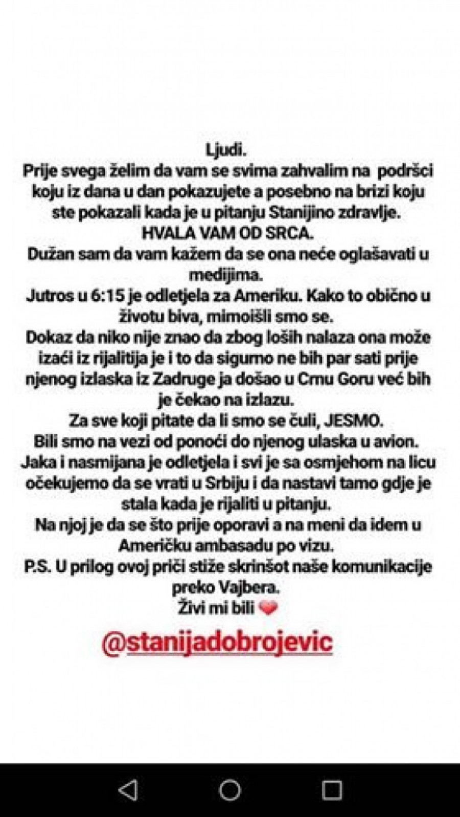 Stanija Dobrojević napustila je Srbiju i jutros u šest sati odletela avionom za Ameriku.