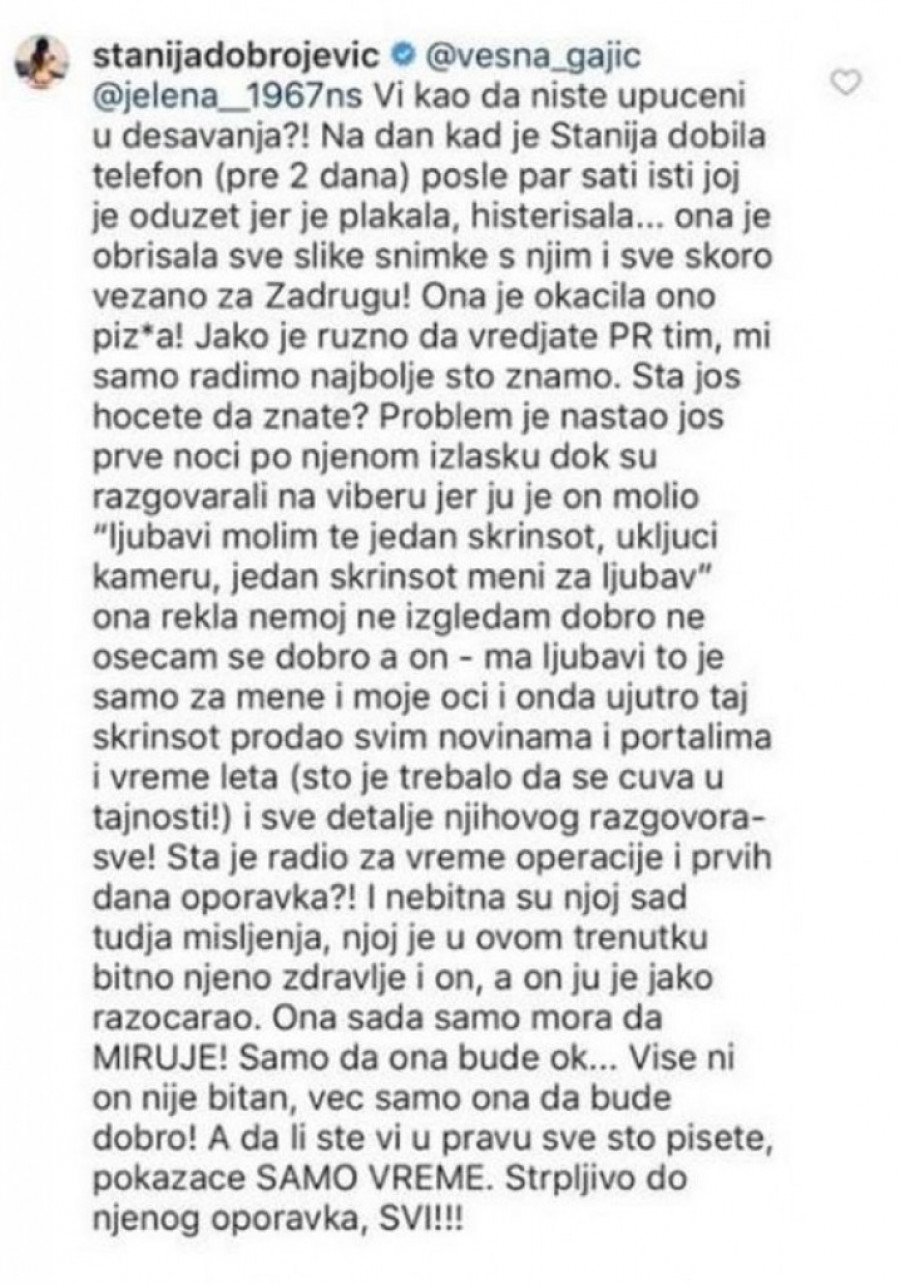 - Na dan kada je Stanija dobila telefon (pre dva dana) posle par sati isti joj je oduzet jer je plakala, histerisala... Ona je obrisala sve slike, snimke s njim i sve skoro vezano za Zadrugu! Ona je okačila ono pi**a! Jako je ružno da vređate PR tim, mi samo radimo najbolje što znamo. Šta još hoćete da znate? Problem je nastao još prve noći po njenom izlasku dok su razgovarali na viberu jer ju je on molio "ljubavi molim te daj jedan skrinšot, uključi kameru, jedan skrinšot meni za ljubav", ona nije htela jer nije izgledala dobro i nije se dobro osećala, a on je nastavio "Ma ljubavi to je samo za mene i moje oči, a onda ujutru taj skrinšot prodao svim novinarima i portalima i vreme leta (što je trebalo da se čuva u tajnosti) i sve detalje njihovog razgovora!