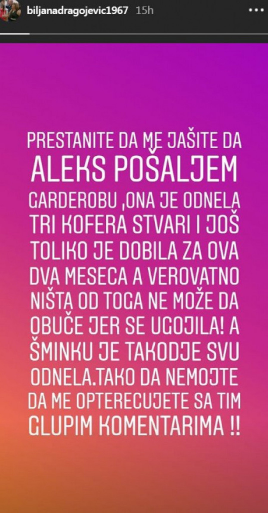 - Prestanite da me jašete da Aleks pošaljem garderobu! Ona je odnela tri kofera stvari, i još toliko je dobila za ova dva meseca, a verovatno ništa od toga ne može da obuče jer se ugojila! A šminku je takođe svu odnela. Tako da, nemojte da me opterećujete sa tim glupim komentarima - poručila je Biljana putem društvenih mreža.