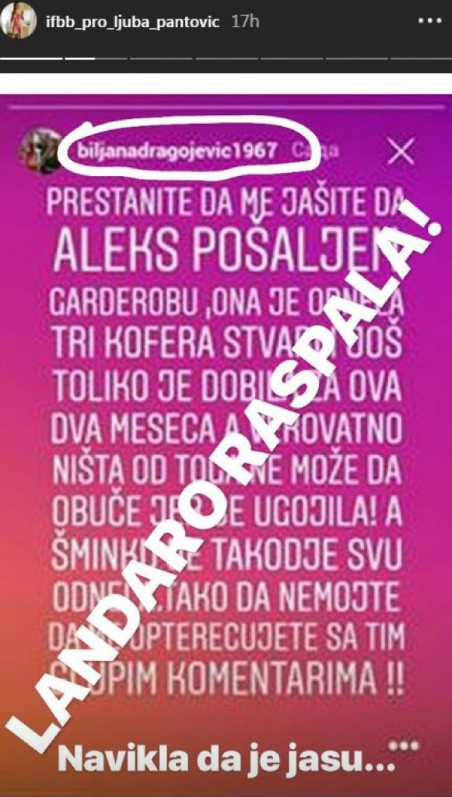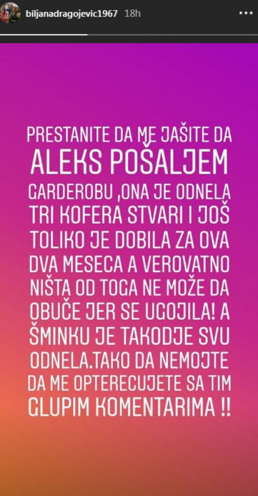 - Prestanite da me jašete da Aleks pošaljem garderobu! Ona je odnela tri kofera stvari, i još toliko je dobila za ova dva meseca, a verovatno ništa od toga ne može da obuče jer se ugojila! A šminku je takođe svu odnela. Tako da, nemojte da me opterećujete sa tim glupim komentarima - napisala je Biljana, a onda se uključila Ljuba koja je preko njene objave dodala: