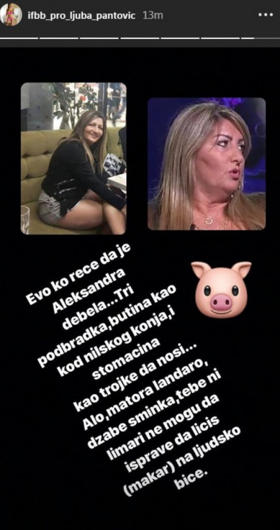 Foto: instagram.com/ifbb_pro_ljuba_pantovic- Evo ko reče da je Aleksandra debela. Tri podbradka, butina kao kod nilskog konja, i stomačina kao trojke da nosi... Alo, matora landaro, džabe šminka, tebe ni limari ne mogu da isprave da ličiš (makar) na ljudsko biće- napisala je Ljuba.
