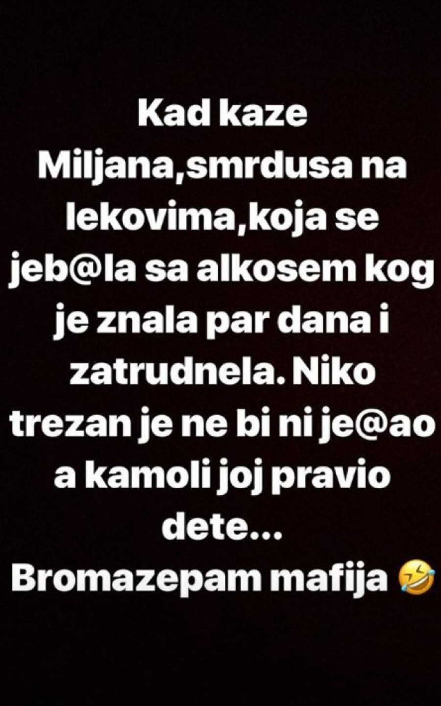 -Kad kaže Miljana, smrduša na lekovima, koja se jeb*la sa alkosem kog je znala par dana i zatrudnela. Niko trezan je ne bi je*ao, a kamoli joj pravio dete. Bromazepam mafija- napisala je Ljuba na svom Instagramu.