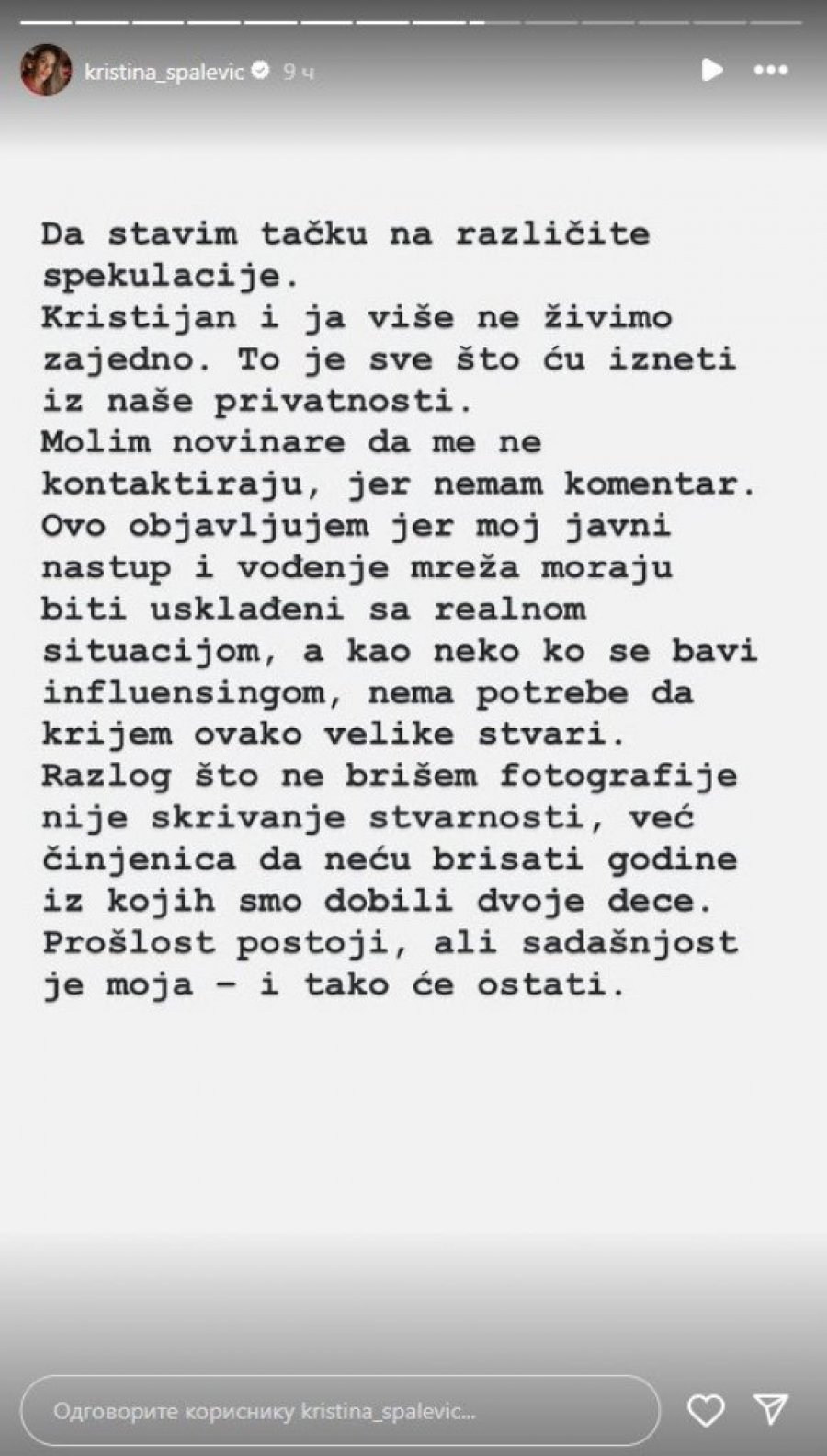 - Da stavim tačku na različite spekulacije. Kristijan i ja više ne živimo zajedno. To je sve što ću izneti iz naše privatnosti. Ovo objavljujem jer moj javni nastup i vođenje mreža moraju biti usklađeni s realnom situacijom, a kao neko ko se bavi influensingom, nema potrebe da krijem ovako velike stvari. Razlog zašto ne brišem fotografije nije skrivanje stvarnosti, već činjenica da neću brisati godine iz kojih smo dobili dvoje dece. Prošlost postoji, ali sadašnjost je moja i tako će ostati - napisala je Kristina na Instagramu.