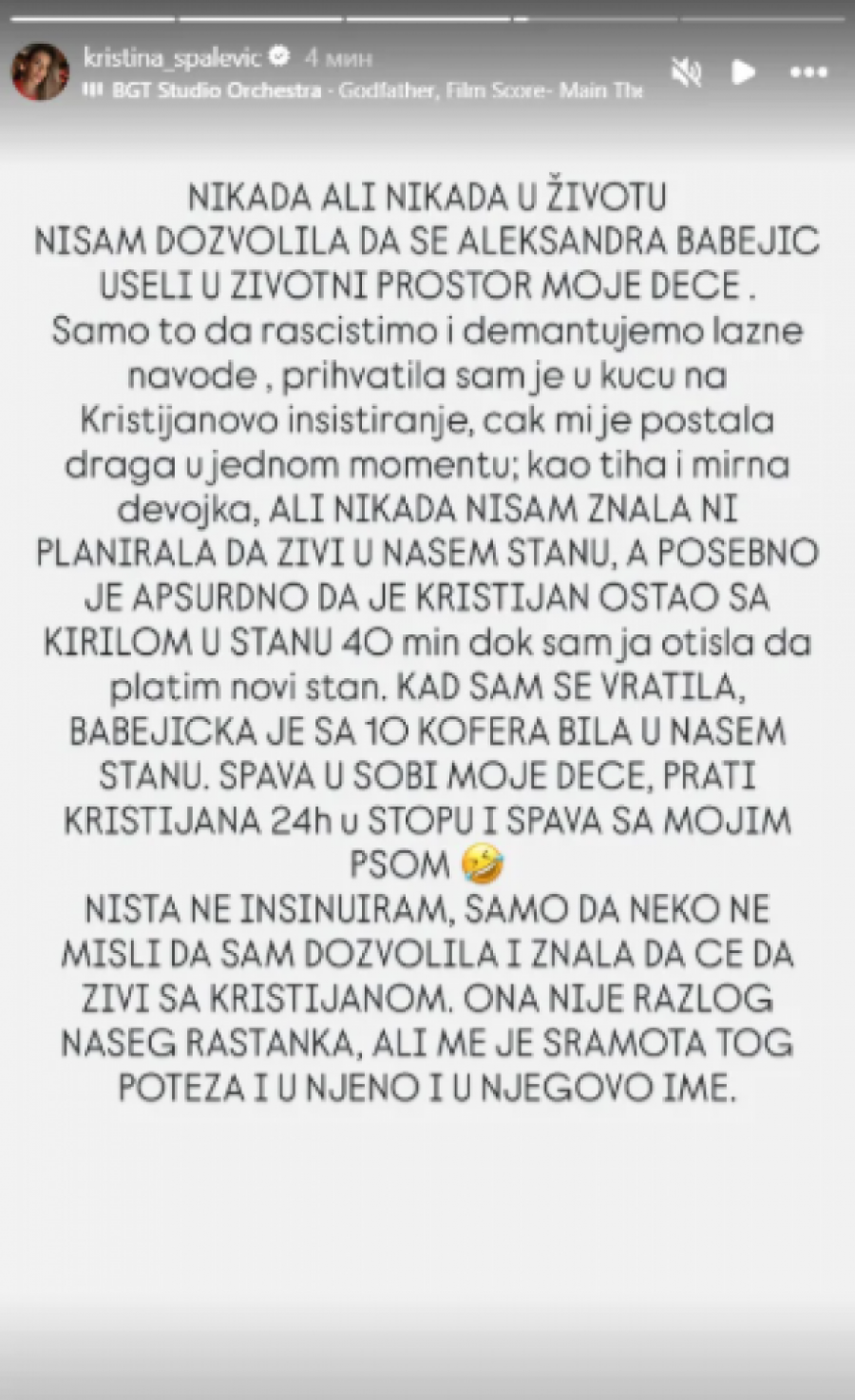 - Nikada u životu nisam dozvolila da se Aleksandra Babejić useli u životni prostor moje dece. Samo to da razjasnimo i demantujemo lažne navode. Prihvatila sam je u kuću na Kristijanovo insistiranje, čak mi je postala i draga u jednom momentu. Kao tiha i mirna devojka, ali nikada nisam znala ni planirala da živi u našem stanu, a posebno je apsurdno da je Kristijan ostao sa Kirilom u stanu 40 minuta dok sam ja otišla da platim novi stan. Kad sam se vratila, Babejićka je sa 10 kofera bila u našem stanu. Spava u sobi moje dece, prati Kristijana 24h u stopu i spava sa mojim psom – napisala je Kristina, pa dodala: