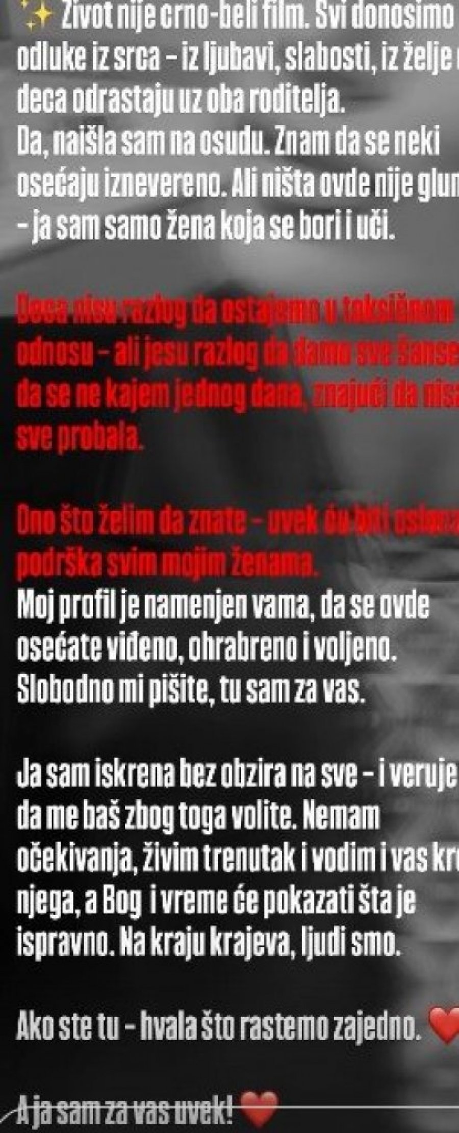 - Život nije crno-beli film. Svi donosimo odluke iz srca, iz ljubavi, slabosti, iz želje da deca odrastaju uz oba roditelja. Da, naišla sam na osudu. Znam da se neki osećaju iznevereno. Ali ništa ovde nije gluma, ja sam samo žena koja se bori i uči. Deca nisu razlog da ostajemo u toksičnom odnosu, ali jesu razlog da damo sve šanse. l da se ne kajem jednog dana, znajući da nisam sve probala - napisala je Kristina i dodala da će uvek ostati iskrena, kakve god bile reakcije okoline.