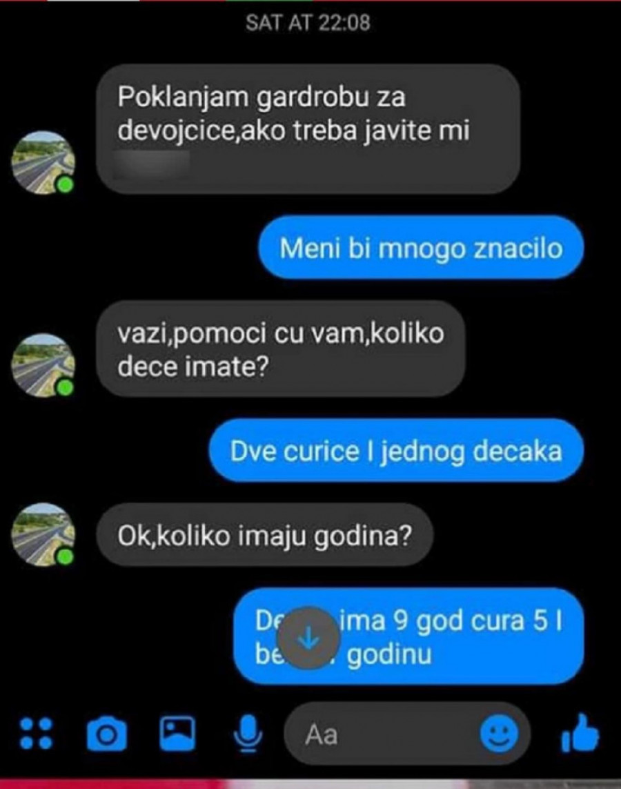 Foto: facebook.com/printscreen/Photo by Kat Jayne from PexelsNakon uvodne poruke na Fejsbuku, predator je odmah ciljano gađao na probleme ove majke, nudeći joj garderobu za njenu decu. Da bi ostvario bliži kontakt, i privoleo majku da mu veruje, pedofil predator - Dragana, obećala je da da će deci pokloniti veliki broj komada odeće, uz, kako je navela, suknjice koje su "jako lepe i kratke do gaćica".