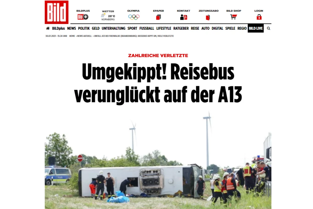 Na nemačkom autoputu A13 između Stakova i Frajvaldea, u saveznoj državi Brandenburg, prevrnuo se autobus iz Srbije. U njemu je bilo 34 putnika, a 19 je povređeno.