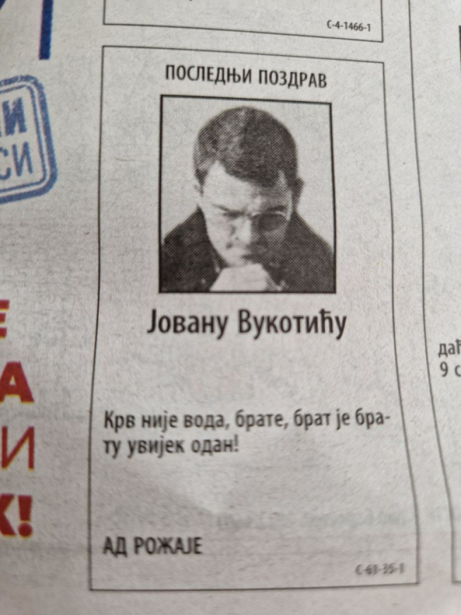 BRAT JE BRATU UVIJEK ODAN: Misteriozna čitulja Jovanu Vukotiću osvanula u beogradskim novinama (FOTO)