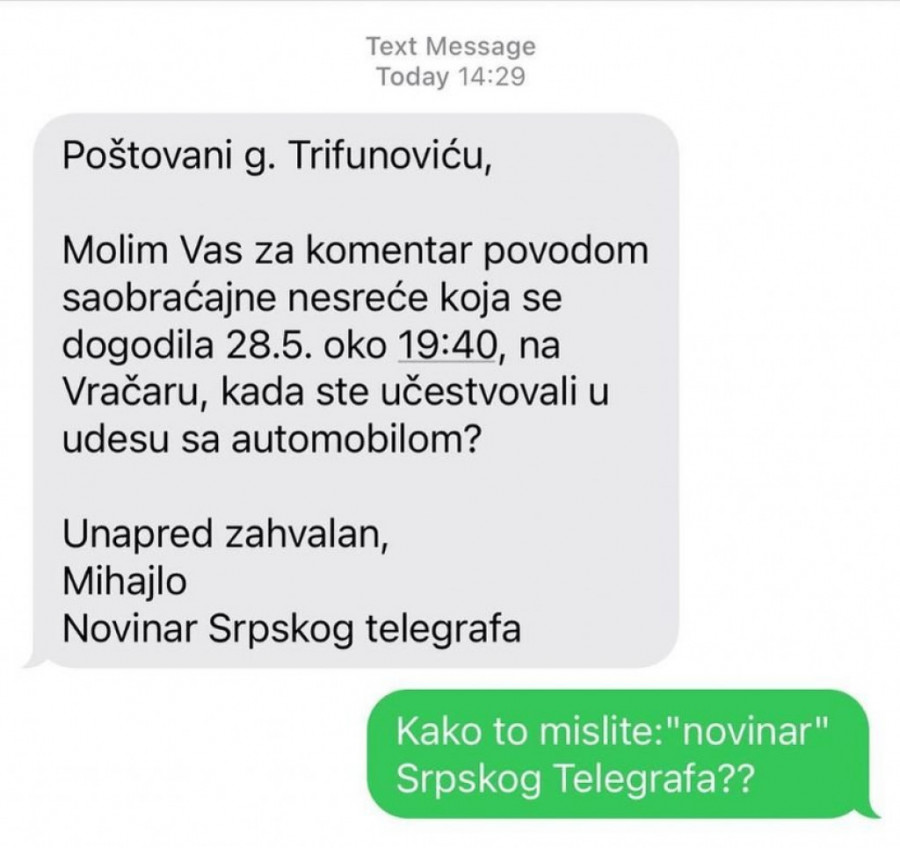 - Kako to mislite: "novinar" Srpskog telegrafa?? - pisalo je u poruci upućenoj našem novinaru.
