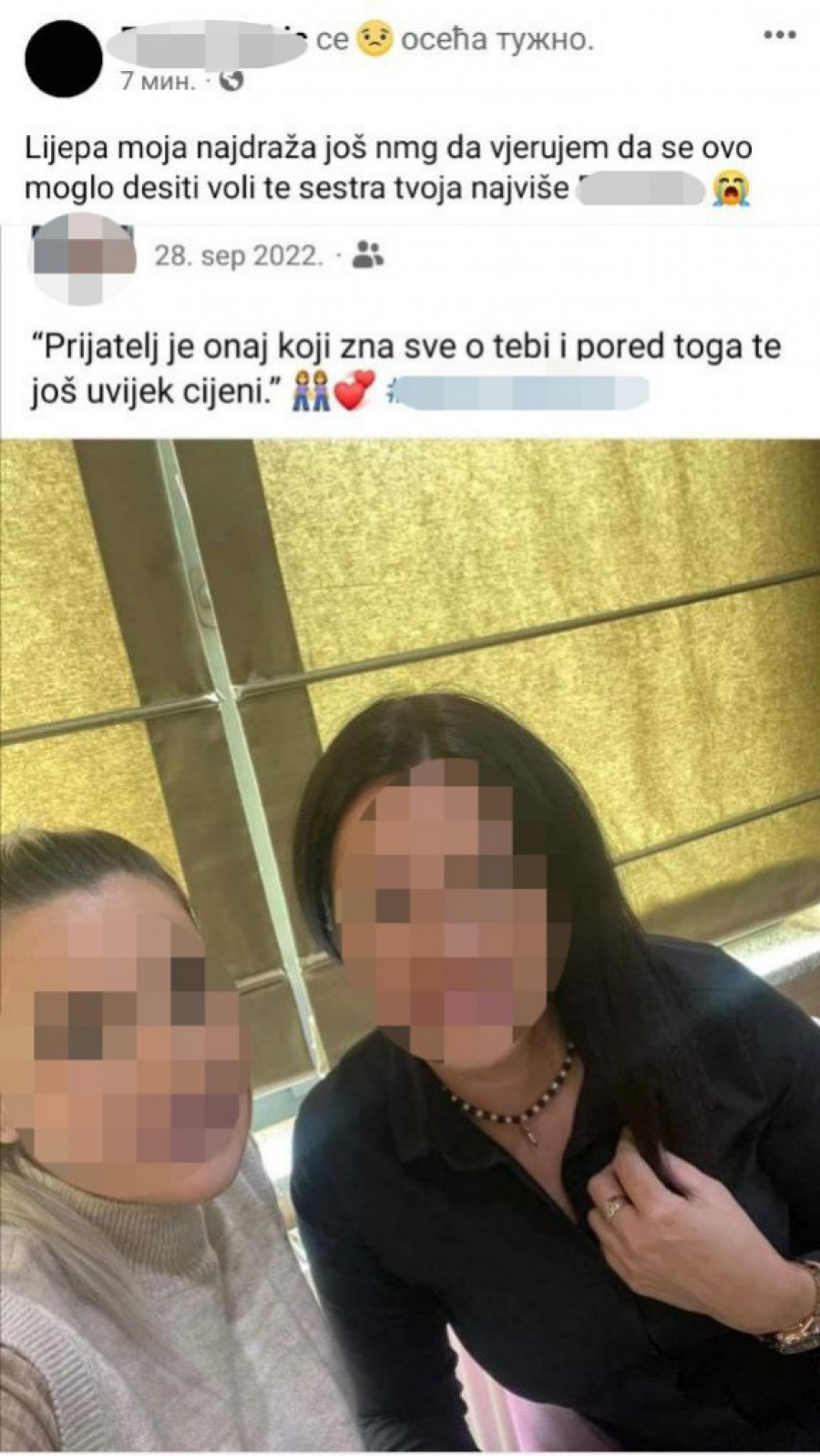 - Lepa moja najdraža, još ne mogu da verujem da se ovo moglo desiti. Voli te sestra tvoja najviše - napisala je E. G. na društvenoj mreži Fejsbuk.