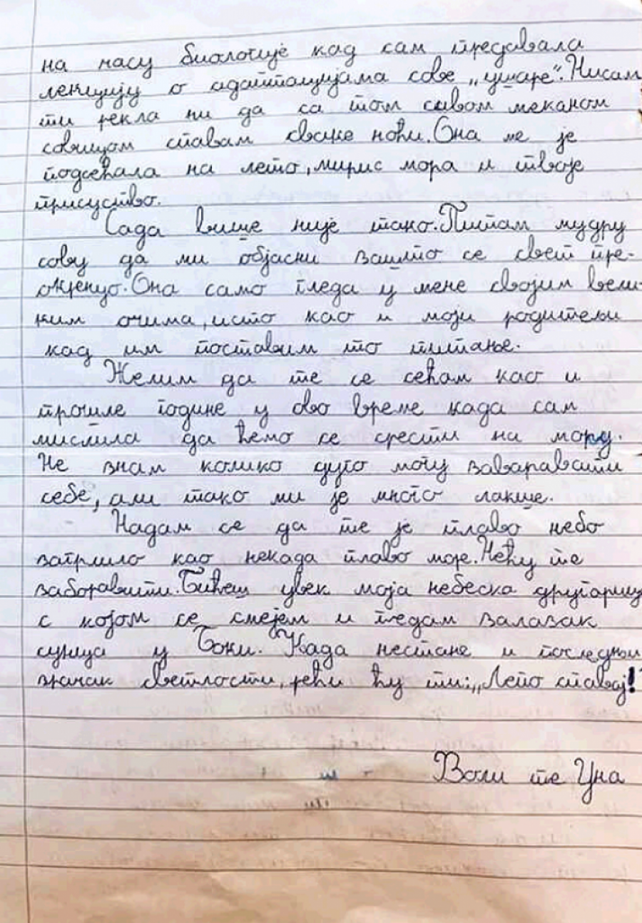 Ovo pismo podelila je majka ubijene devojčice na Fejsbuku uz komentar: Jedna mala devojčica je održala lekciju odraslima o sećanju. Srce drago i prepametno.