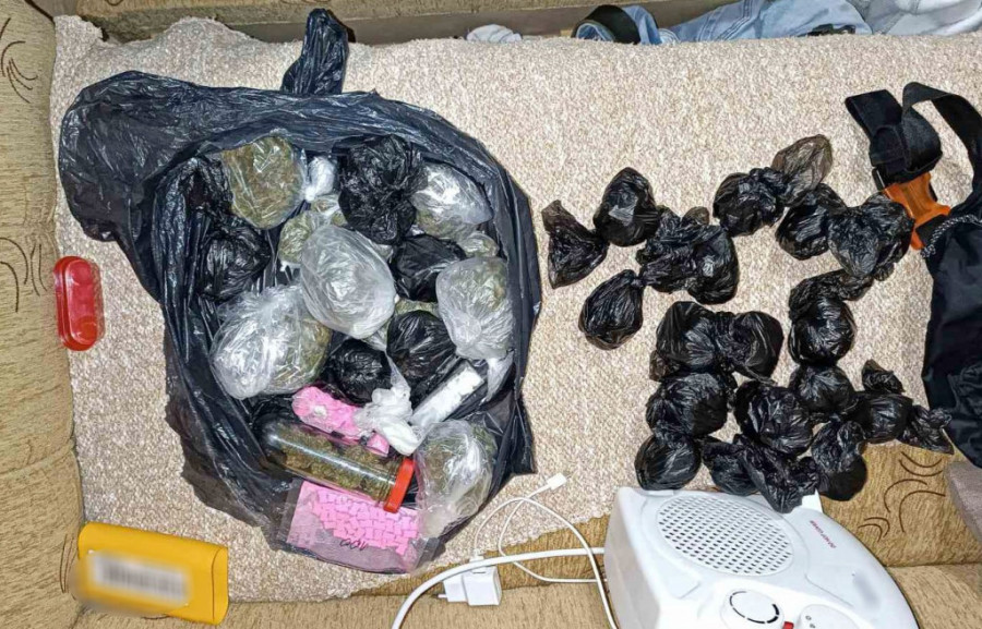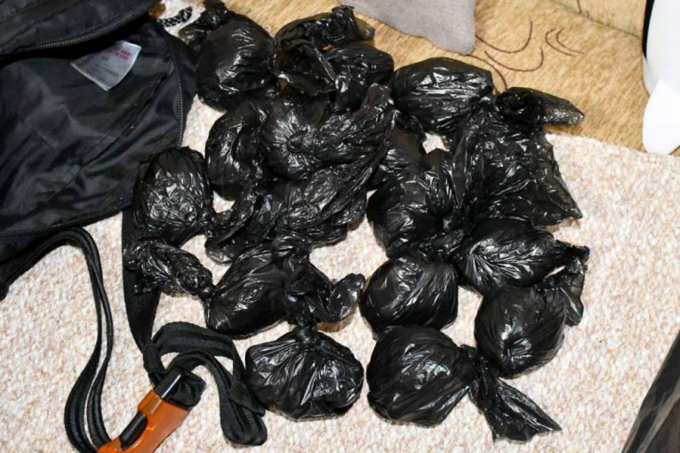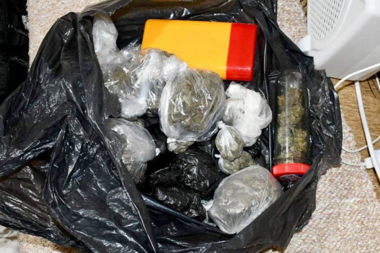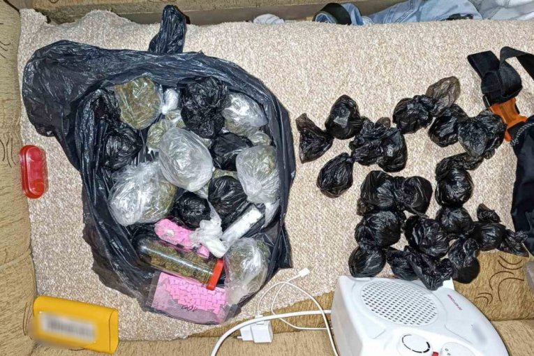 Policija je pretresom kuće koju osumnjičeni koristi pronašla oko 935 grama materije za koju se sumnja da je marihuana, oko 40 grama ekstazija, oko 20 grama amfetamina i oko pet grama praha za koji se sumnja da je kokain, kao i tri vagice za precizno merenje.