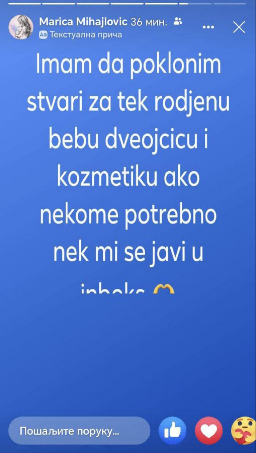 - Imam da poklonim stvari za tek rođenu devojčicu i kozmetiku. Ako je nekome potrebno neka se javi u inbox - navela je na svom profilu.