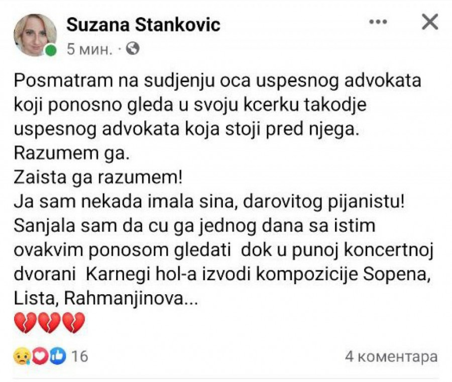 Prethodna dva dana održalo se suđenje roditeljima dečaka ubice u Palati pravde, gde su među prisutnima, po prvi put, bili i Miljana i Vladimir Kecmanović koje zastupaju Borivoje Borović i njegova ćerka Irina. Tim povodom, Suzana je napisala tužne misli: