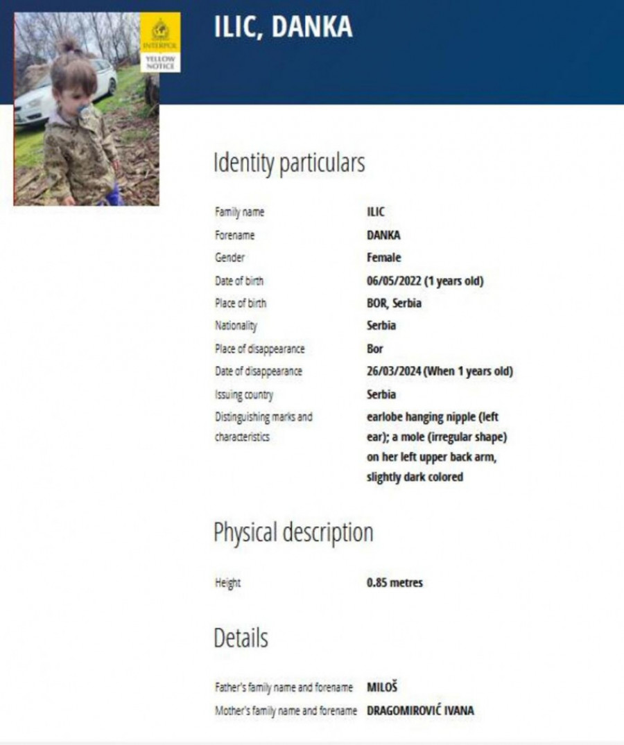 Interpol je raspisao potragu za nestalom nestalom devojčicom (2). Za nestalom devojčicom iz Bora na snazi je žuta poternica.