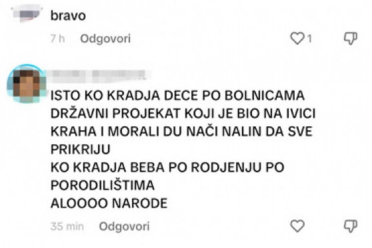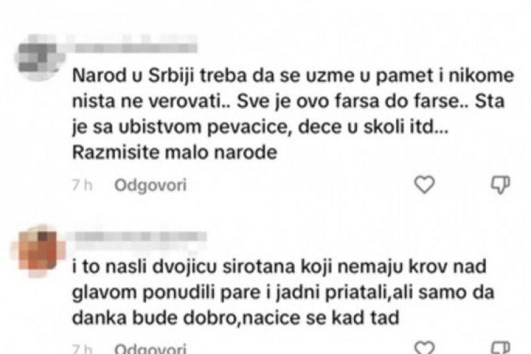 - E moji vi! Žao mi je ove dvojice što se ucenjeni, ili naterani, ili plaćeni da priznaju da su ubili ovo dete da bi se zataškala ova katastrofa koja se dešava oko nas, odnosno trgovina decom. Eto, iskreno, žao mi ih je, jer će navući bes građana, naroda... Za koju godinu će oni izaći iz zatvora, preseliti se negde u inostranstvo pod drugim identitetom, a ovo dete, nažalost, nikad naći nećemo. Otvorite oči i skapirajte šta se dešava oko nas - izgovorila je u kameru i dodala: