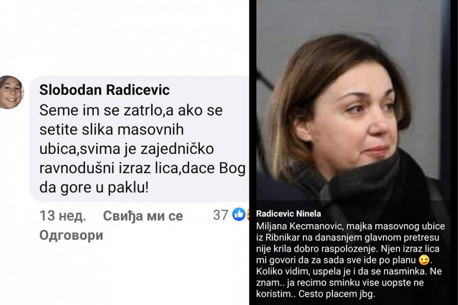 - Miljana Kecmanović majka masovnog ubice iz Ribnikara na današnjem glavnom pretresu nije krila dobro raspoloženje. Njen izraz lica mi govori da za sada sve ide po planu. Koliko vidim uspela je i da se našminka. Ne znam... ja recimo šminku više i ne koristim- napisala je Ninela na društvenim mrežama posle jednog od ročišta na suđenju Kecmanovićima.