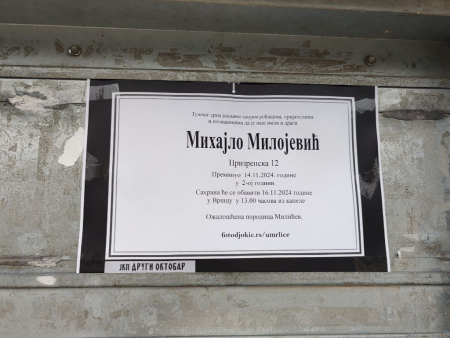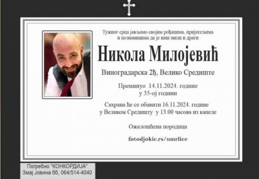 - Tužnog srca javljamo svojim rođacima, prijateljima i poznanicima da je naš mili i dragi Nikola Milojević preminuo 14.11.2024. godine u 35-oj godini - piše na umrlici koju potpisuje ožalošćena porodica.