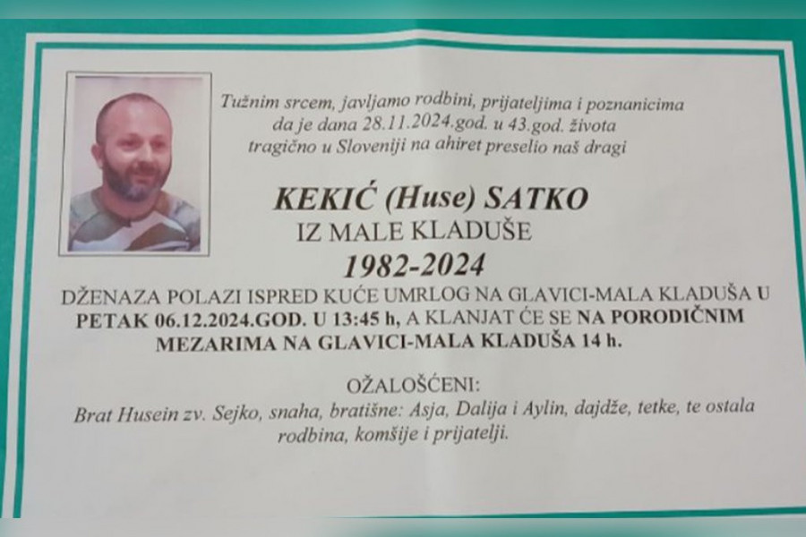 Objavljena je umrlica povodom tragične smrti Satka Kekića iz Male Kladuše, koji je ubijen 28. novembra u 43. godini u Sloveniji.