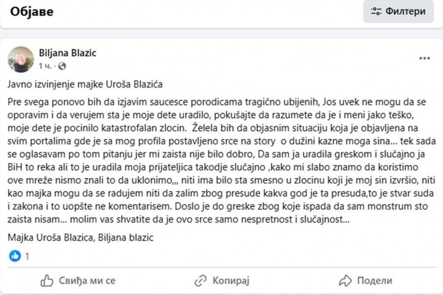 -Došlo je do greške zbog koje ispada da sam monstrum što zaista nisam. Molim vas shvatite da je ovo srce samo nespretnost i slučajno - zaključila je Biljana i opet napisala da je majka masovnog ubice iz Dubone.