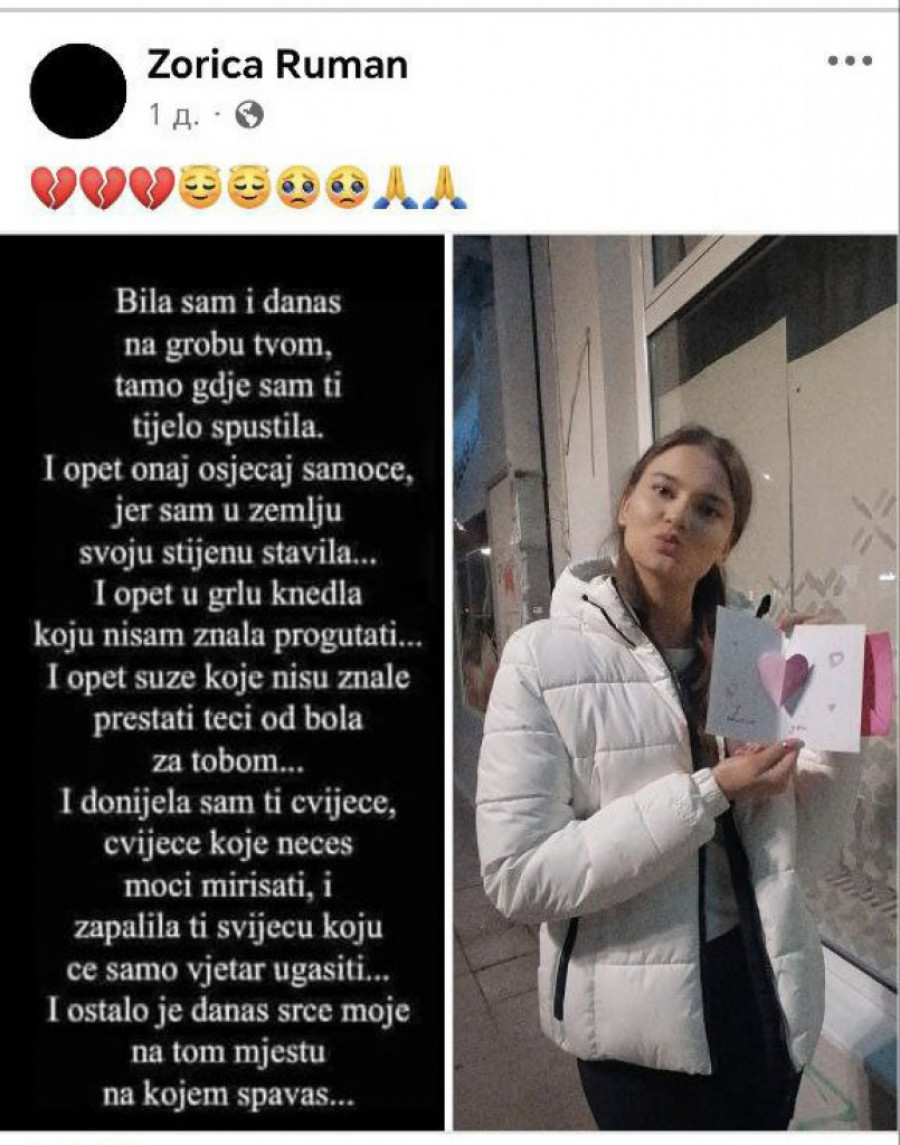 - Bila sam i danas na grobu tvom tamo gde sam ti telo spustila. I opet onaj osećaj samoće, jer sam u zemlju svoju stenu stavila i opet u grlu knedla koju nisam znala progutati i opet suze koje nisu znale prestati teći od bola za tobom. Donela sam ti cveće koje nećeš moći da mirišeš i zapalila ti sveću koju će samo vetar da ugasi. Ostalo je danas srce moje na tom mestu na kojem spavaš - napisala je Zorica na Fejsbuku.